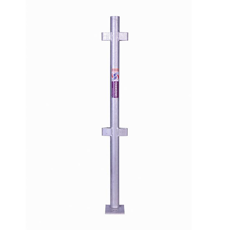 The Kwikstage Edge Protection Standards are safety-critical components designed to create secure guardrail systems on scaffolding platforms, preventing falls and protecting workers from edge hazards. Constructed from 48.3mm galvanized steel tubes with welded base plates and adjustable clamps, these standards provide a rigid vertical support for top rails, midrails, and kick plates. The base plate features pre-drilled holes for both concrete fixing and deck mounting, while the clamp mechanism allows height adjustment in 150mm increments to meet various safety regulations.